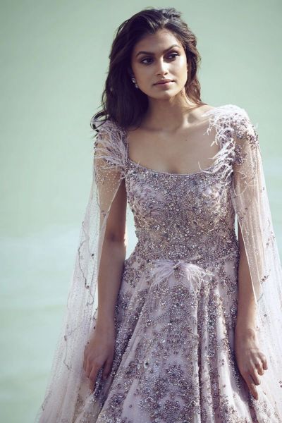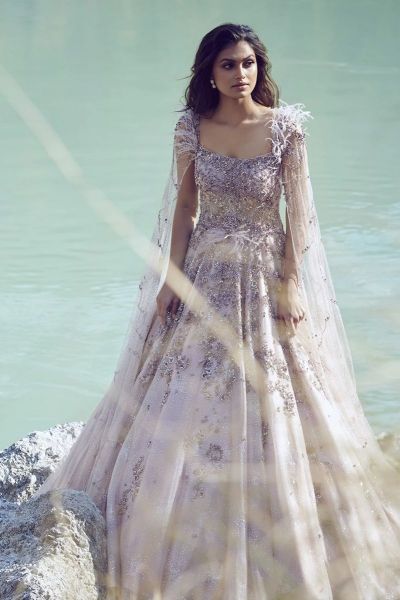 A beautiful Lilac Shimmer Tulle Gown with elongated sleeves and Zardozi embroidery accented with cut-dana, French sequins, and feathers.