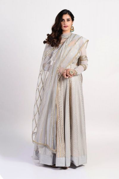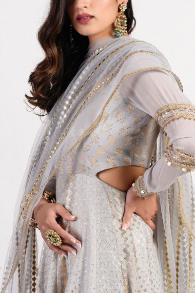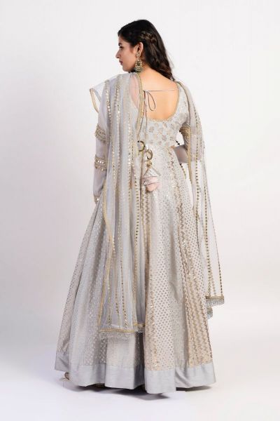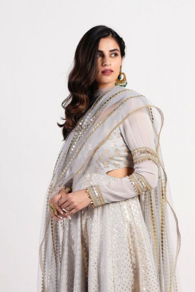 Featuring a silver grey anarkali enhanced with cut-outs at the sides and embellished with sequins and lace on the sleeves giving a complete ensemble with an intricate mirror embroidery on dupatta