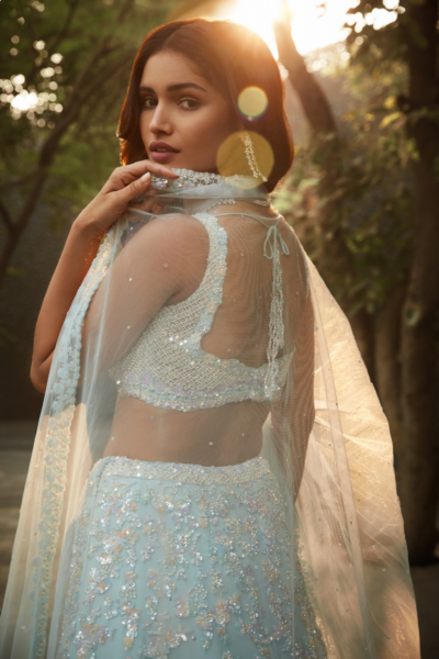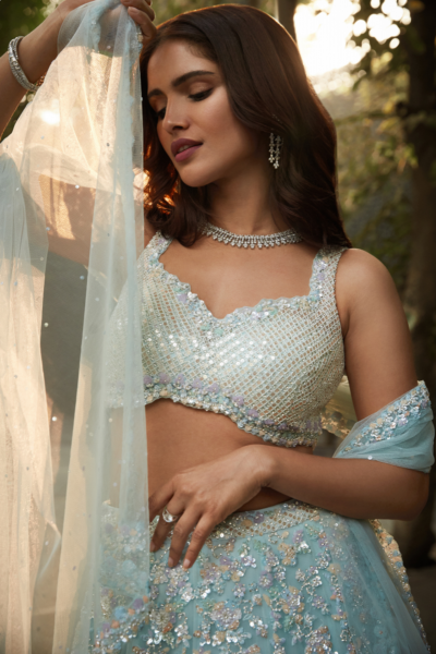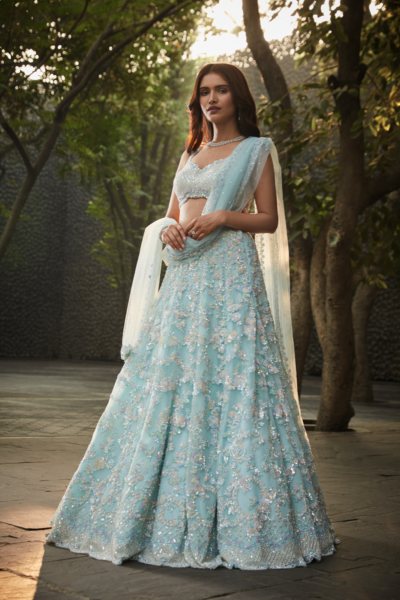This sky blue georgette lehenga collection is combined with a soft tulle dupatta and features sequin resham embroidery.
