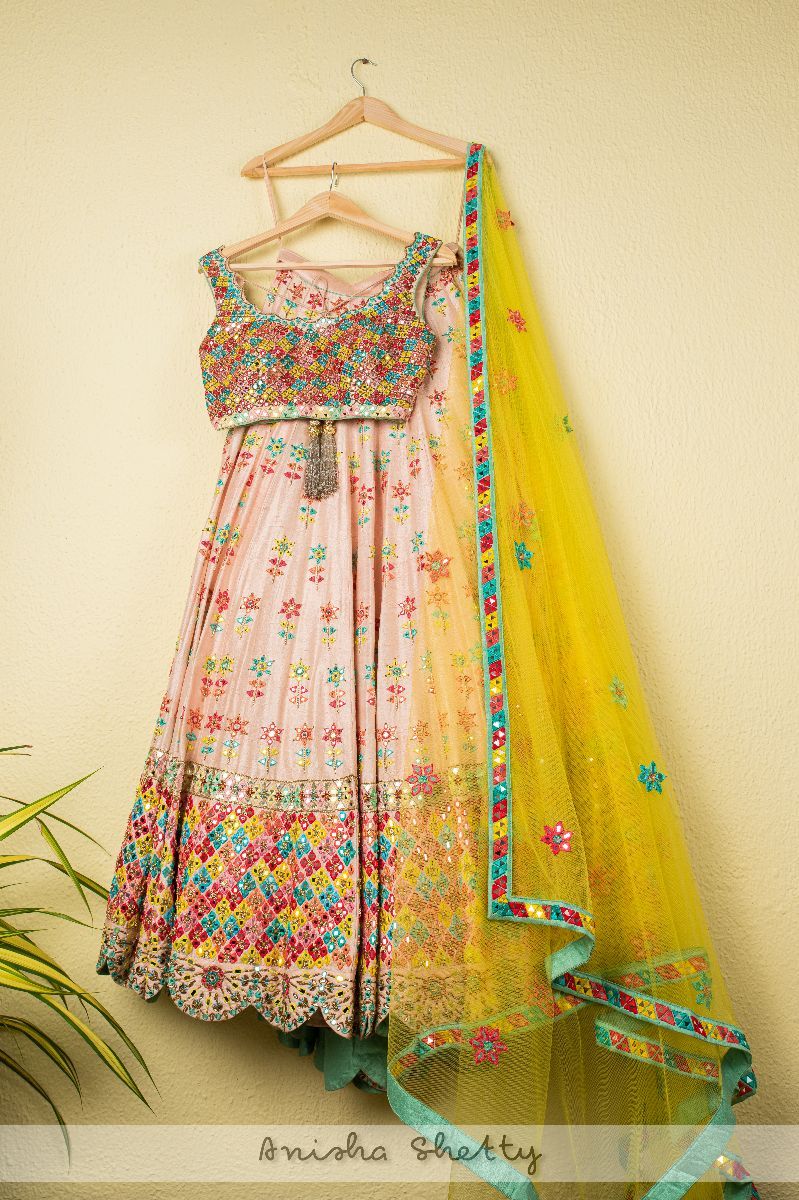 An Absolute Dazzler - Cream Silk Lehenga hand embellished with mirror work in summer colours and with a stunning scallop border.