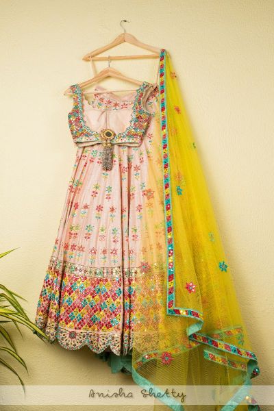 The blouse is a complete stunner completely decorated with mirror work and accentuated by the bead scallop neckline in the front and back. The Yellow Dupatta complete the summer bride look.