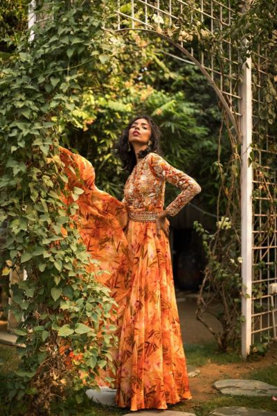 A beautiful tangerine anarkali with a ruffled duppata. Perfect for those women who love to slay it fashionably even while donning the most traditional Indian attire.