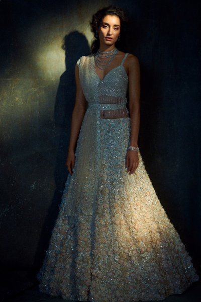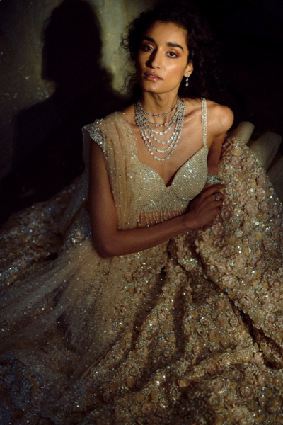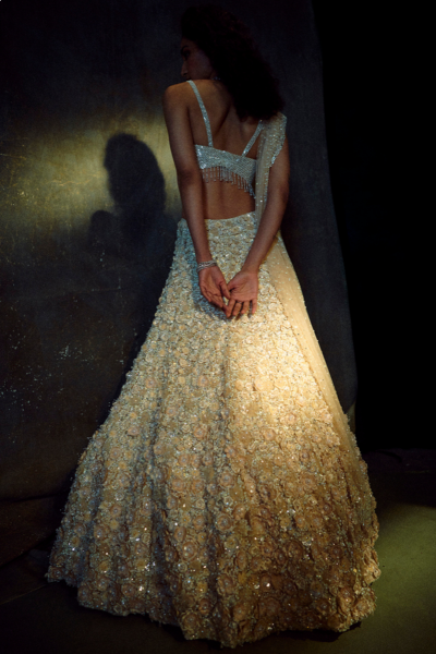 Three-dimensional florettes are highlighted with sequins and crystals in this champagne lehenga collection. An embroidered net dupatta with sequins completes the ensemble.