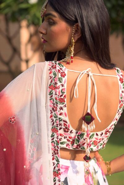 Crepe white printed lehnga with ruffle layers. Maroon, pink and white hand embroided blouse finished with mirror tassles. Shaded white and maroon net dupatta, hand embroided on all four sides and finished with drops.