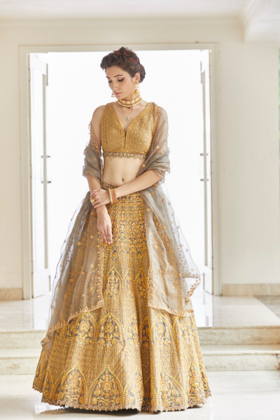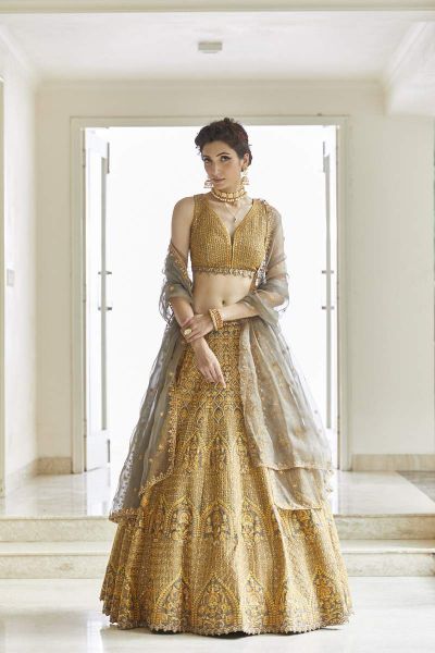 With delicate dori work and amazing patterns this dazling gold lehenga set features a skirt which is paired with an embroidered organza dupatta.