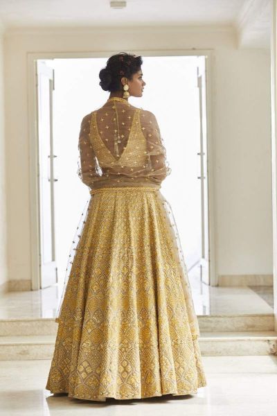 With delicate dori work and amazing patterns this dazling gold lehenga set features a skirt which is paired with an embroidered organza dupatta.