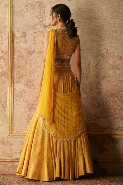 Golden yellow folk printed embroidered skirt and blouse paired with embroidered dupatta and pearl embroidered belt.