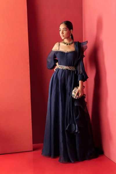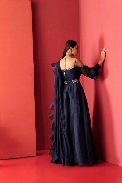 Navy blue flared jumpsuit with a ruffled dupatta paired with a jewelled belt.