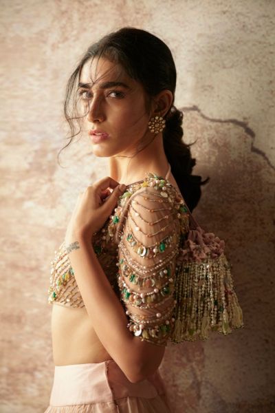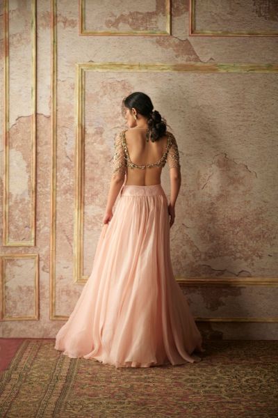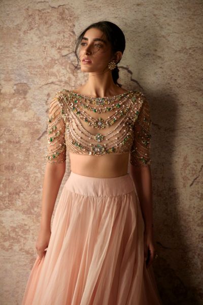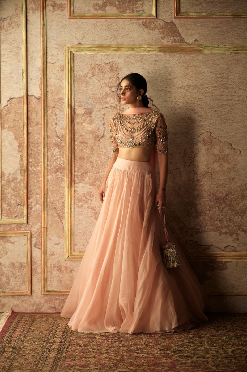 Champagne jewelled blouse with peach organza skirt and embroidered dupatta.Makes it a perfect choice for evening functions.